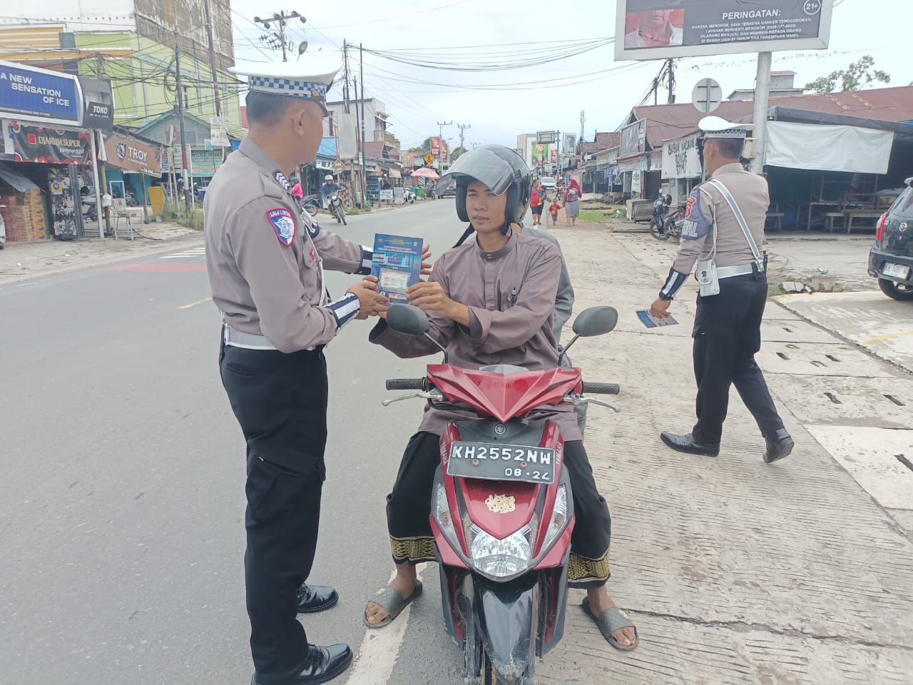Personil Satlantas Polres Katingan sebagai anggota preemtif bergerak turun ke Jalan untuk meninformasikan kepada pengendara melalui pembagian brosur, untuk menciptakan keamanan dan keselamatan berlalu lintas.