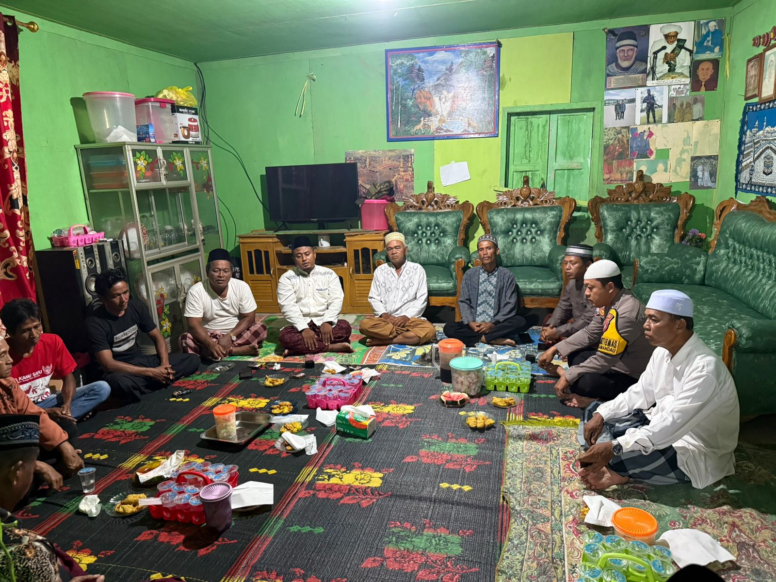 Kegiatan ini sekaligus menjadi ajang silaturahmi dalam rangka menghadiri acara syukuran di Kediaman Rumah Bapak H. MIDUN Pada kesempatan tersebut, Bhabinkamtibmas tak hanya menjalin keakraban dengan warga, namun juga memanfaatkan momen untuk menyampaikan pesan-pesan kamtibmas. Ia mengingatkan pentingnya kewaspadaan terhadap pelaku tindak pidana, serta meningkatkan pengawasan lingkungan dari potensi peredaran narkoba dan kenakalan remaja seperti tawuran.